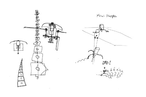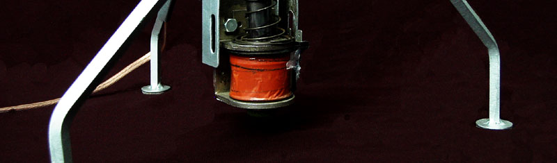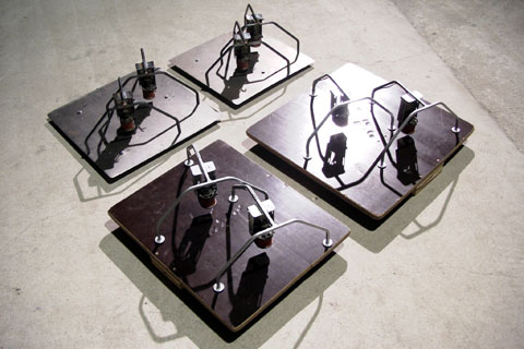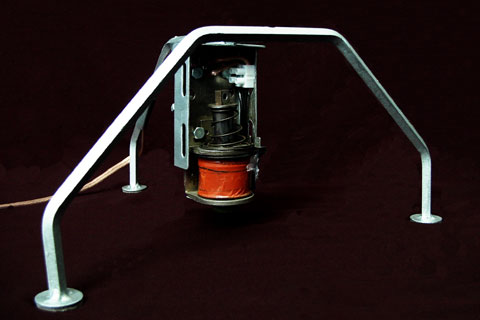 Magnets taken from nail guns have been screwed to a small tripod. Eight Hoppers knock and
