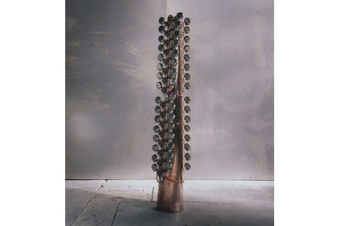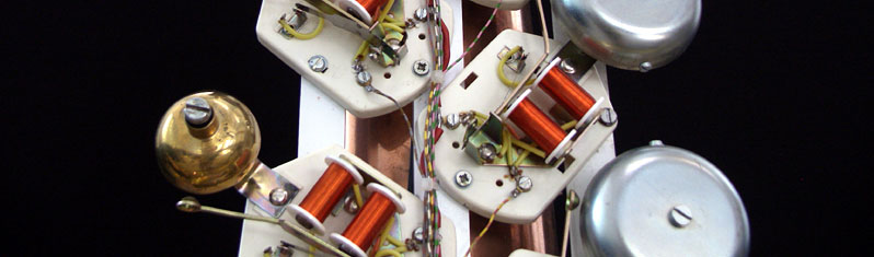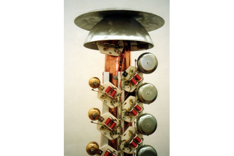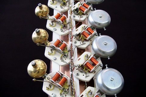 Twenty-eight modified doorbells are fastened to a column of copper sheet. Bell magnets