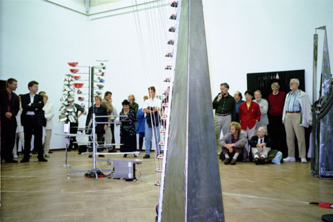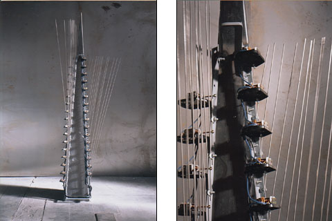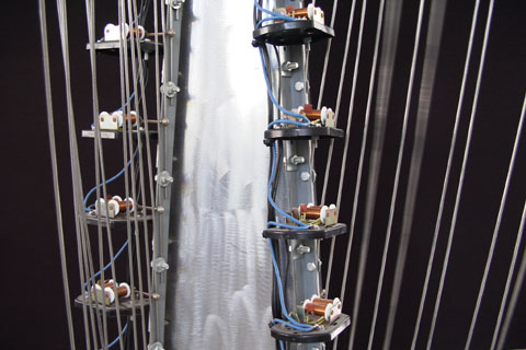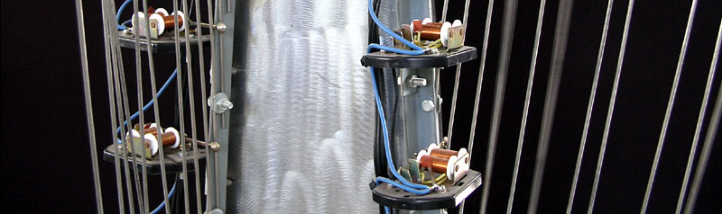 The mechanical principle of sound generation. Disassembled bell magnets strike steel spring rods.