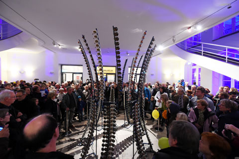 72 telephone bells have been mounted on a slightly concave carrier of 3.10 meters in height