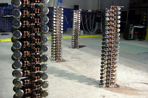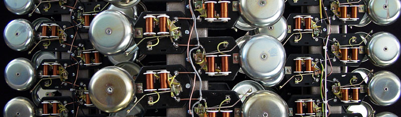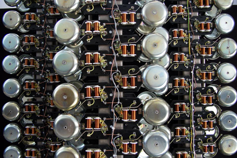 and are struck by magnets. In addition to these standard telephone bells, the artist also uses