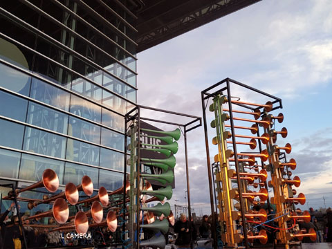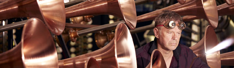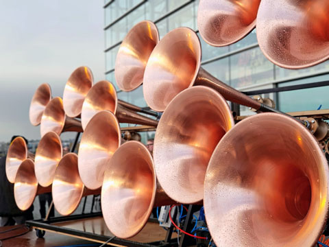 modified ship’s horns. 32 horns have copper bells whose sound color is reminiscent of trumpets.